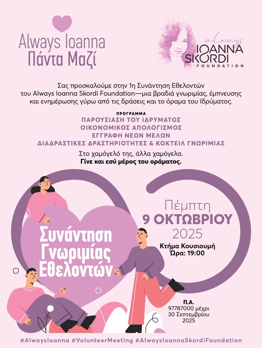 Σας προσκαλούμε την Πέμπτη 9 Οκτωβρίου 2025 στην 1η Συνάντηση Εθελοντών του Always Ioanna Skordi Foundation-μια βραδιά γνωριμίας, έμπνευσης και ενημέρωσης γύρω από τις δράσεις και το όραμα του Ιδρύματος. Η συνάντηση θα γίνει στο κτήμα Κουσιουμή η ώρα 19:00.
